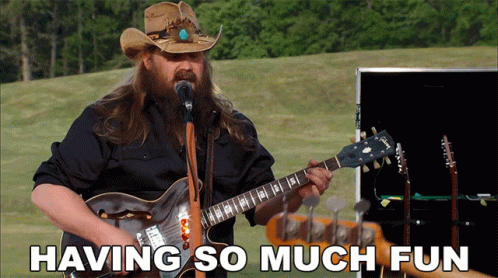 Chris Stapleton performs outdoors, singing and playing guitar with the caption 'Having So Much Fun'.