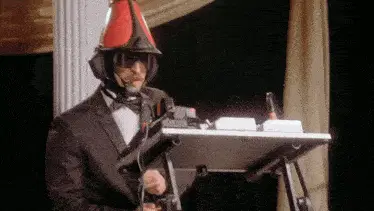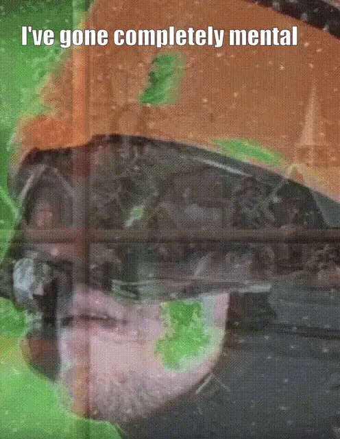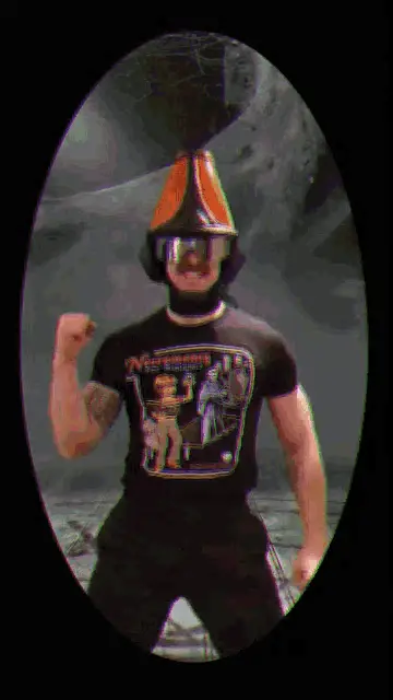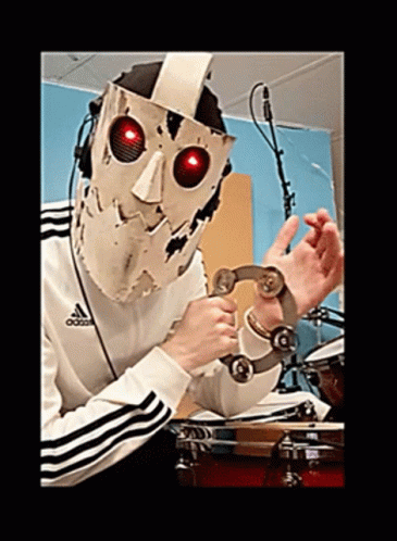 Havve Hogan from TWRP, wearing a unique mask and headphones, enthusiastically plays a tambourine.