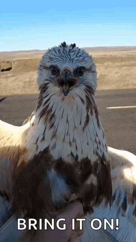 A hawk, held by a person, appears to challenge with an open beak and 'Bring It On!' caption.