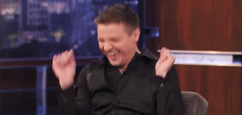 Jeremy Renner, known as Hawkeye/Clint Barton, laughs heartily while sitting in a chair.