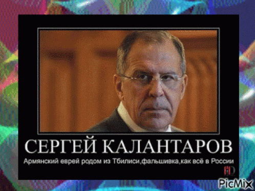Framed picture of Sergey Lavrov with a Russian caption about his identity and Russia, related to Karabakh.