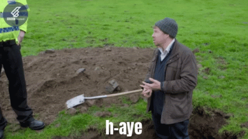 A Scottish farmer, part of Scot Squad, stands in a field with a shovel, saying "h-aye" to a police officer.
