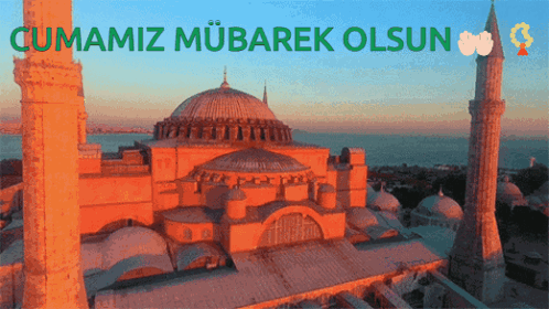 A beautiful mosque at sunset with the greeting 'May our Friday be blessed' displayed on screen.