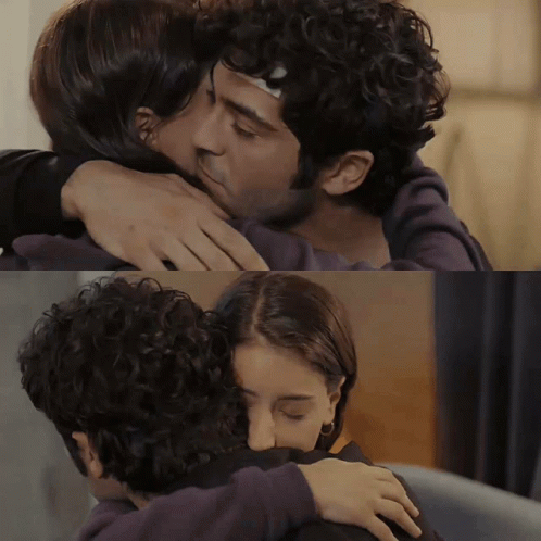 Hazal Kaya and Burak Deniz share an emotional hug, with Burak wearing a head bandage, from the series Bizim Hikaye.