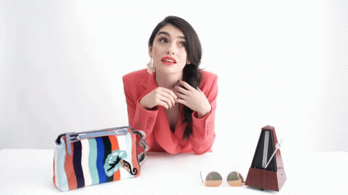 Turkish actress Hazar Ergüçlü with a striped bag, sunglasses, and metronome, showing a quirky expression.
