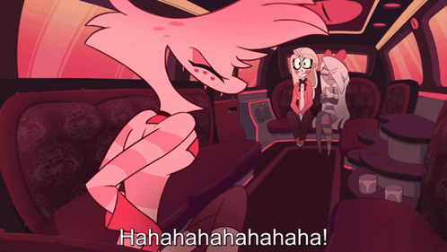 Angel Dust laughing hysterically in a limo with Charlie and Vaggie from Hazbin Hotel.
