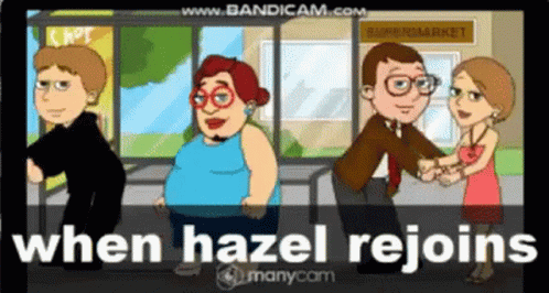 A cartoon group of people, including Hazel, dance and celebrate with the caption 'when hazel rejoins'.