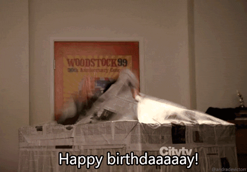 Max Greenfield as Schmidt pops out of a box, arms raised, excitedly shouting 'Happy birthdaaaay!'