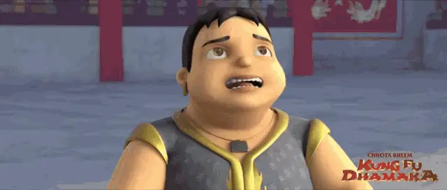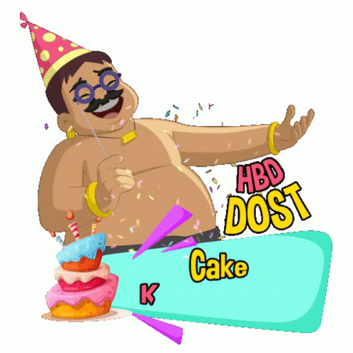 Kalia, from Chhota Bheem, celebrates his birthday in a party hat, asking 'Cake Kahaan Hai?' amidst confetti.
