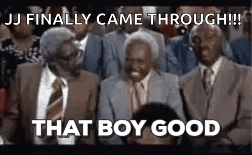 Three men react with joy and approval, exclaiming 'JJ finally came through! That boy good.'