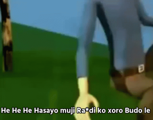 Animated character speaks the phrase 'He He He Hasayo Muji Randi Ko Xoro Le Radi' in a simple 3D environment.