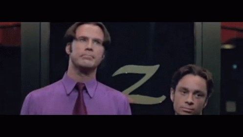 Will Ferrell and Chris Kattan doing their iconic head bob from Night at the Roxbury, wearing purple shirts and ties.