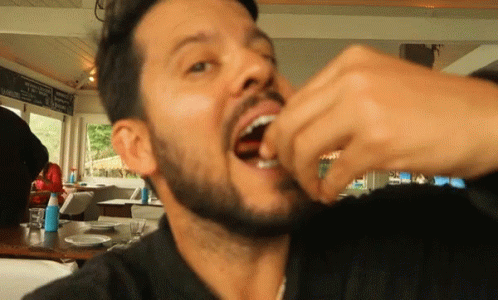 Man with a beard eating food with his hands, looking up at the camera in a restaurant setting.