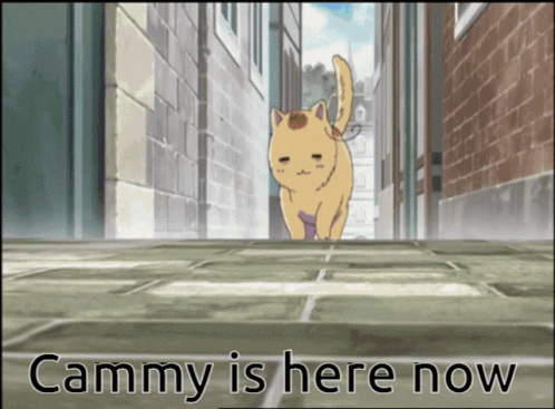 Cammy, the Nekotalia cat, walks down an alleyway with the caption 'Cammy is here now'.