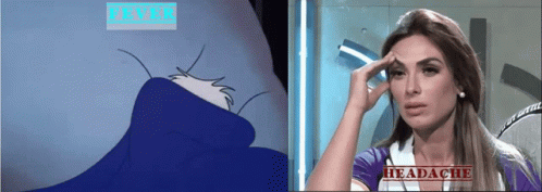 A split-screen shows Donald Duck with a fever and a woman experiencing a headache, illustrating common health problems.