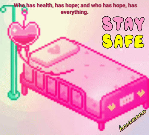 Pixel art of a hospital bed with an IV drip, conveying a message of hope and health: "Stay Safe."