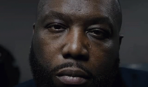 A serious close-up of a member of Run The Jewels, with the impactful text 'Hear What I Say'.