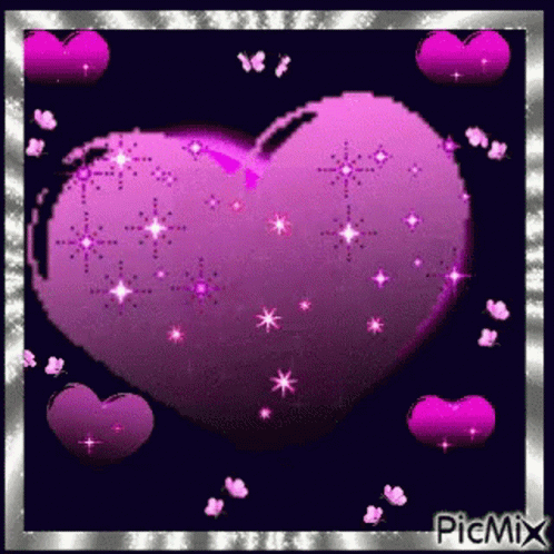 A sparkling purple heart surrounded by smaller pink hearts and fluttering butterflies on a dark background.