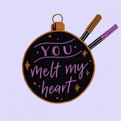 A hand writes 'YOU MELT MY HEART' on a pink, heart-shaped Christmas ornament.