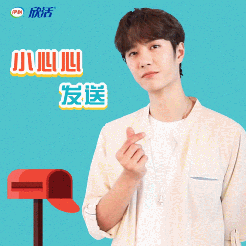 Wang Yibo makes a finger heart gesture next to a red mailbox, promoting Yili Youhuo.