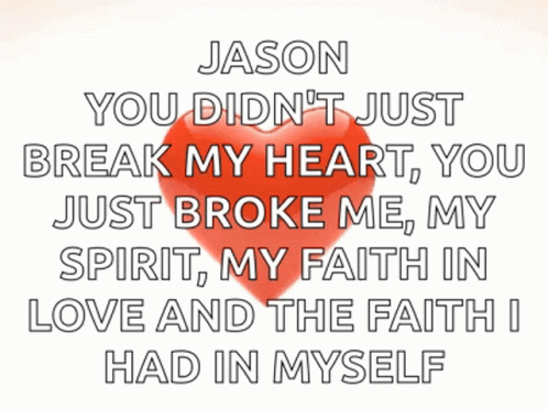 A poignant message about heartbreak, stating 'Jason, you didn't just break my heart, you broke me, my spirit, my faith.'