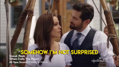 A man and a woman from When Calls The Heart with 'SOMEHOW I'M NOT SURPRISED' on screen. Hearties Elizabeth.
