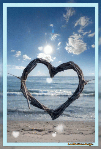 A beautiful heart-shaped wreath made of branches hangs on a sunny beach with the ocean in the background.