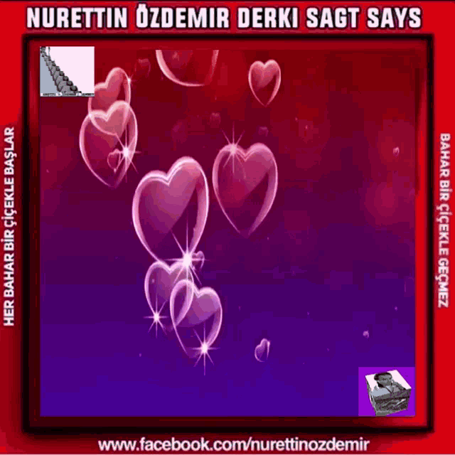 Animated hearts with Nurettin Özdemir's sayings about love and spring in Turkish and other languages.
