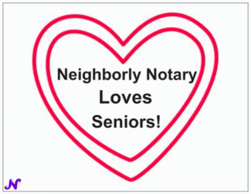 Green heart with 'Neighborly Notary Loves Seniors!' message, representing Roberta Arnone's brand.