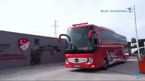Red Mercedes-Benz bus, possibly the 'Hecarim Bus', for the Turkish National Football Team, featuring football graphics.