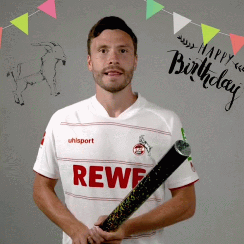 Footballer Jonas Hector, wearing an FC Köln jersey, celebrates his birthday with a confetti cannon.