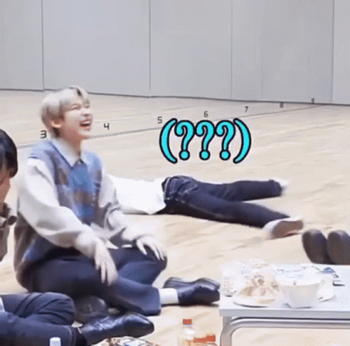 Lee Heeseung looks on with a confused expression as another member lies on the floor during a practice session.
