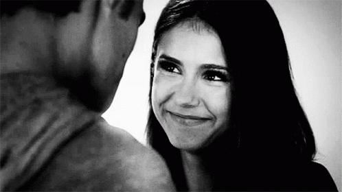 A woman smiles joyfully at a man, sharing a happy moment.