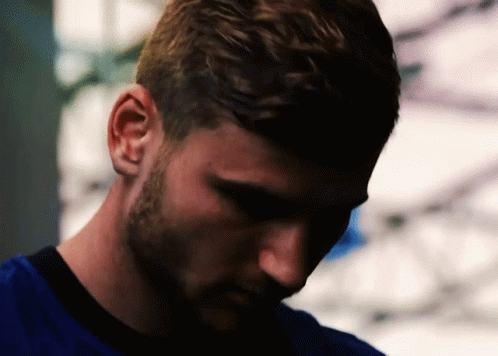 Timo Werner, a Chelsea FC player, looks up with a thoughtful expression.
