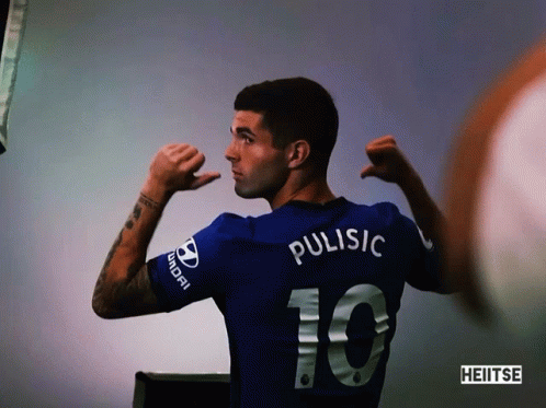 Christian Pulisic in his Chelsea FC jersey making a 'call me' gesture, number 10 on his back.