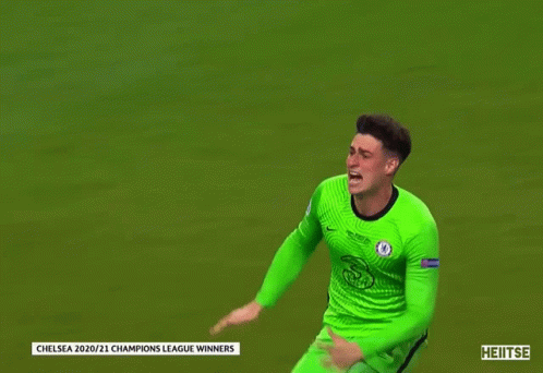 Chelsea FC players Kepa Arizabalaga, Jorginho, Mateo Kovacic, and Ngolo Kante celebrate their 2020/21 Champions League victory.