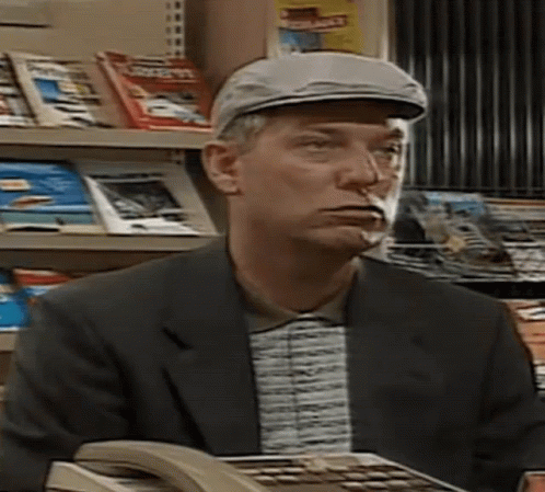 Heinz Becker, wearing a hat and suit, looks confused and thoughtful, possibly overwhelmed, while smoking a cigarette.