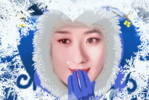 Heka blows a kiss amidst a snowy, winter wonderland backdrop with sparkling snowflakes.