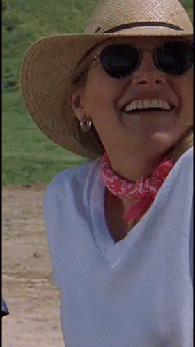 Helen Shaver, portraying Kate Reilly from The Stampede Entertainment Tremors Saga, smiles brightly in a straw hat and sunglasses.
