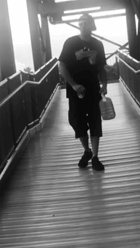 A man in a black shirt and shorts walks confidently down a ramp, carrying a lunchbox.