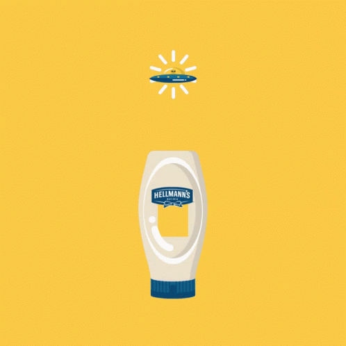 An alien in a UFO beams up a bottle of Hellmann's mayonnaise from a yellow background.