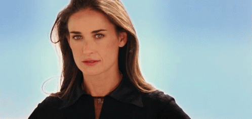 Demi Moore as Madison Lee delivers a direct 'Hello Angels' greeting with a confident gaze.