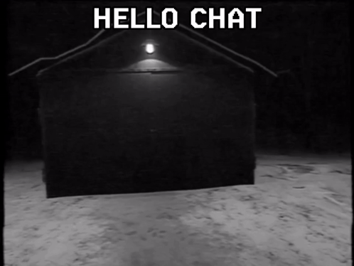 A dark, grainy video featuring the text 'HELLO CHAT' over a mysterious building at night, reminiscent of VHS.
