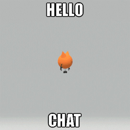 A cute orange 3D cat-like character greets viewers with 'Hello Chat'.