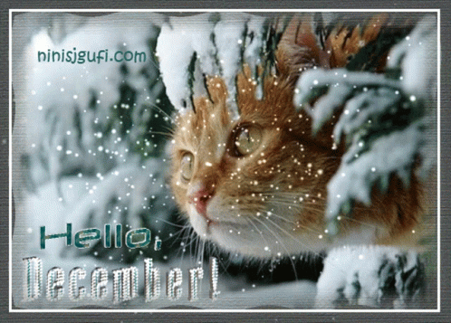 A ginger cat peeking through snow-covered branches, with falling snow and a 'Hello, December!' greeting.