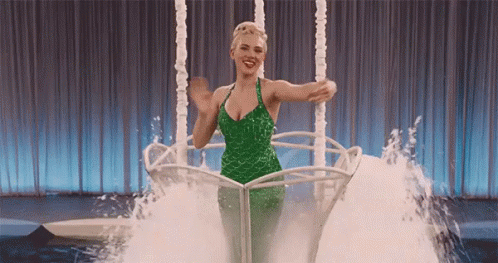 Scarlett Johansson as Dee Anna Moran performs in a green mermaid-like dress, smiling amidst splashing water.
