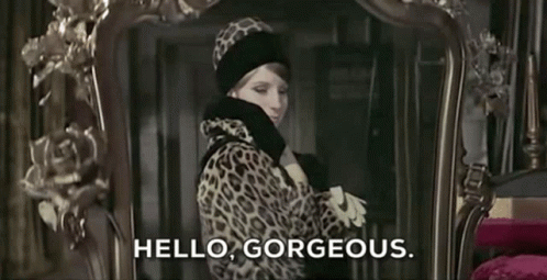 A woman in a leopard print coat smiles and says 'Hello, gorgeous' while looking at herself in a mirror.