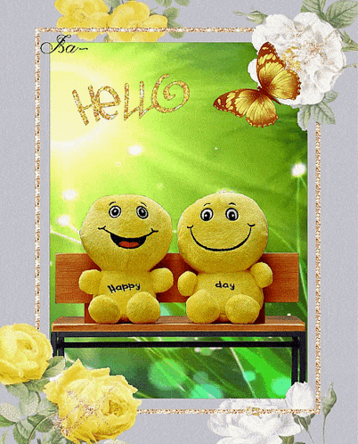 Two smiling yellow plush toys on a bench with 'Hello Happy day' text, framed by flowers and a butterfly.