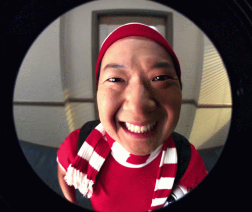 A man wearing a red and white scarf and hat smiles widely through a fisheye peephole.