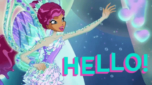 Aisha from Winx Club waves hello with a bright smile, featuring the text 'HELLO!' in pink letters.